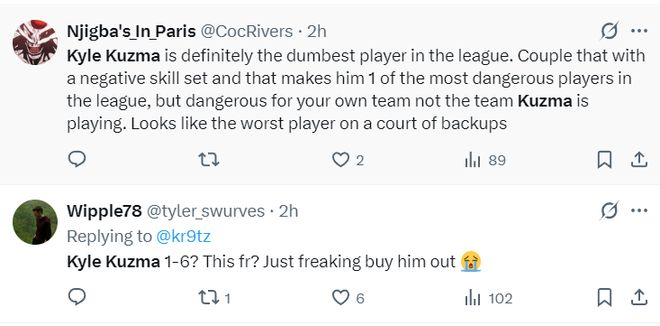 美球迷:库兹马绝对是联盟最愚蠢的球员,加上他糟糕的表现,他成为联盟最具威胁的球员之一,他这种威胁是针对自己的球队,看起来库兹马是联盟最差的球员之一。
